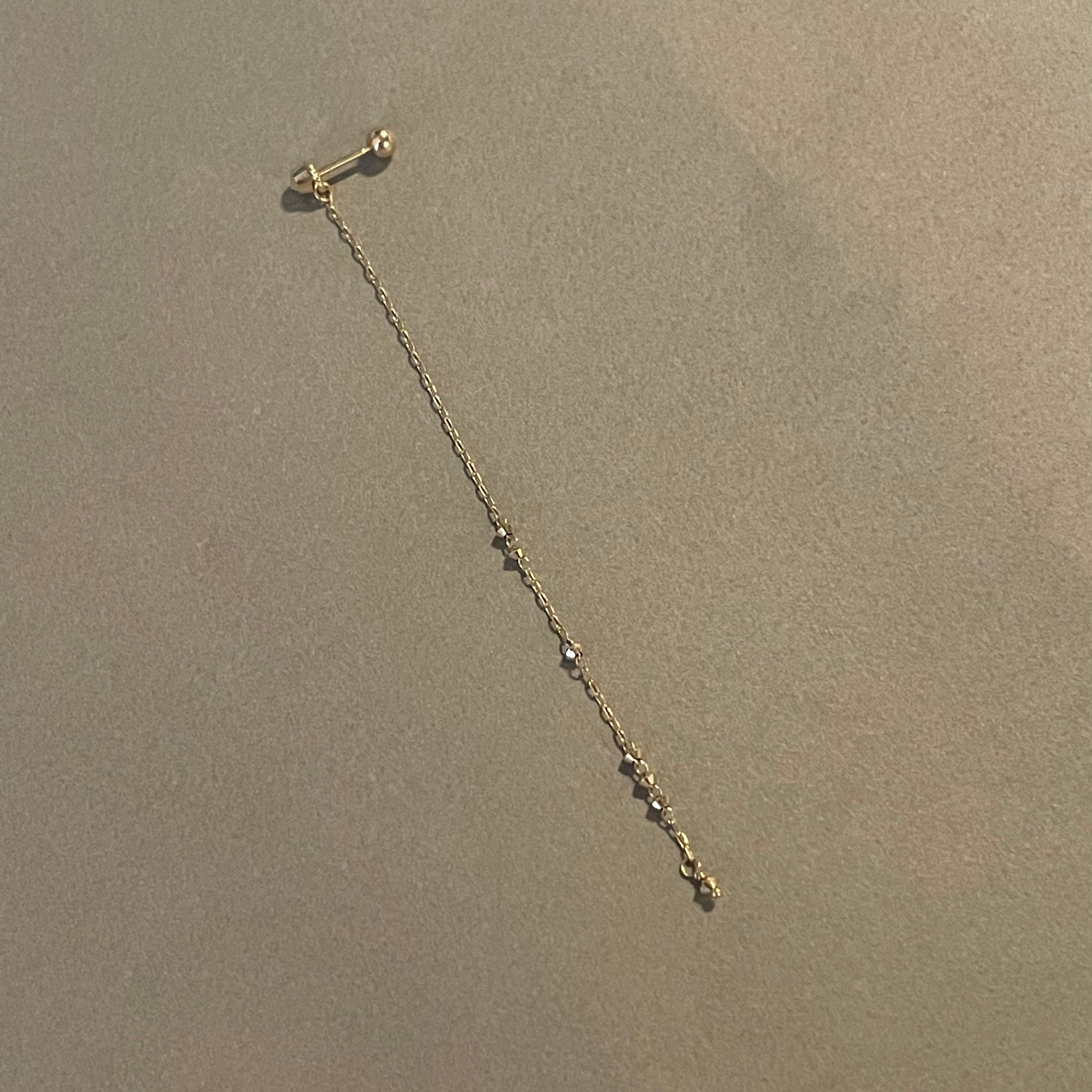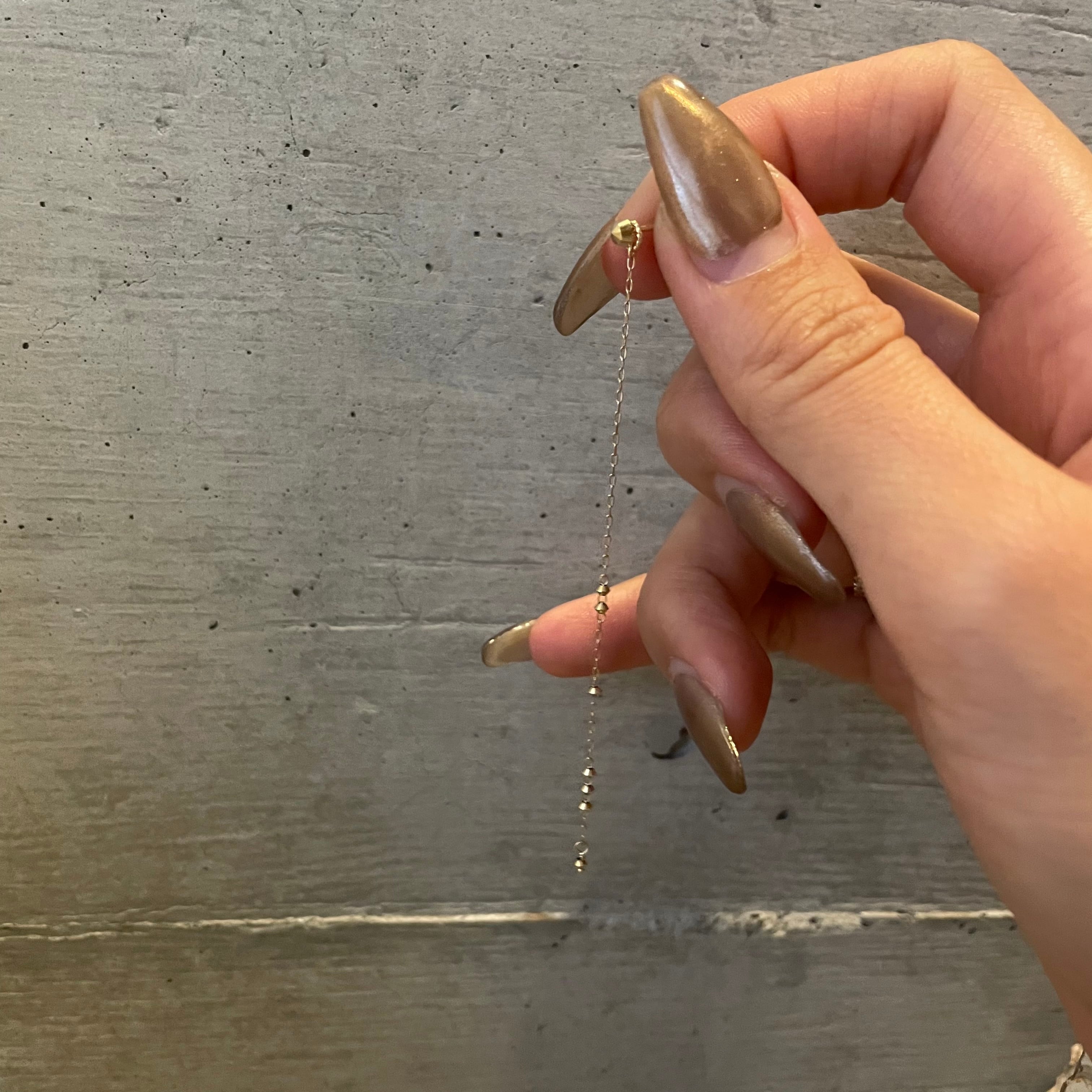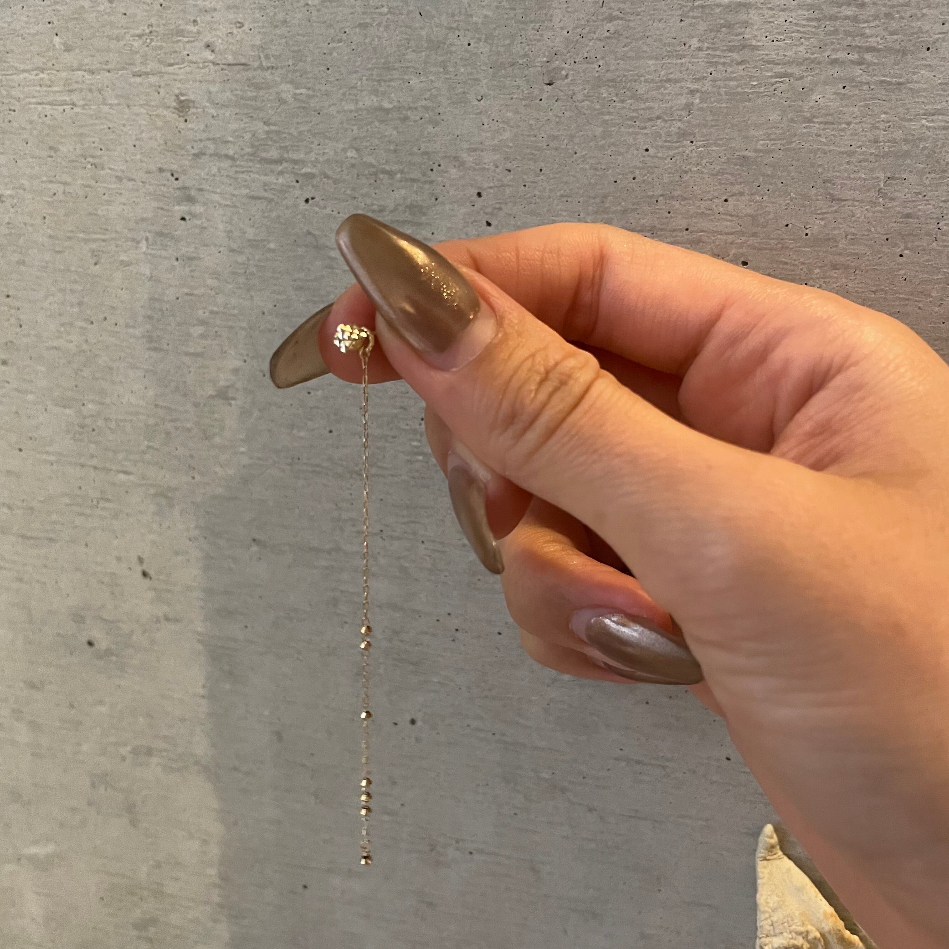 価格:9,900円(税抜) カットビーズが連なるピアスチャーム。 お手持ちのピアスに加えるだけで印象がガラッと変化します。 長さがあるので小ぶりはもちろん、やや存在感のあるピアスまで幅広く相性◎。 ※片耳販売。 素材:K10 サイズ:全長 約7.5cm 【 K10の特徴 】 白っぽいイエローで、スッキリとした爽やかな印象です。 K18に比べて肌なじみがよく、強度もあるので日常づかいにおすすめです。