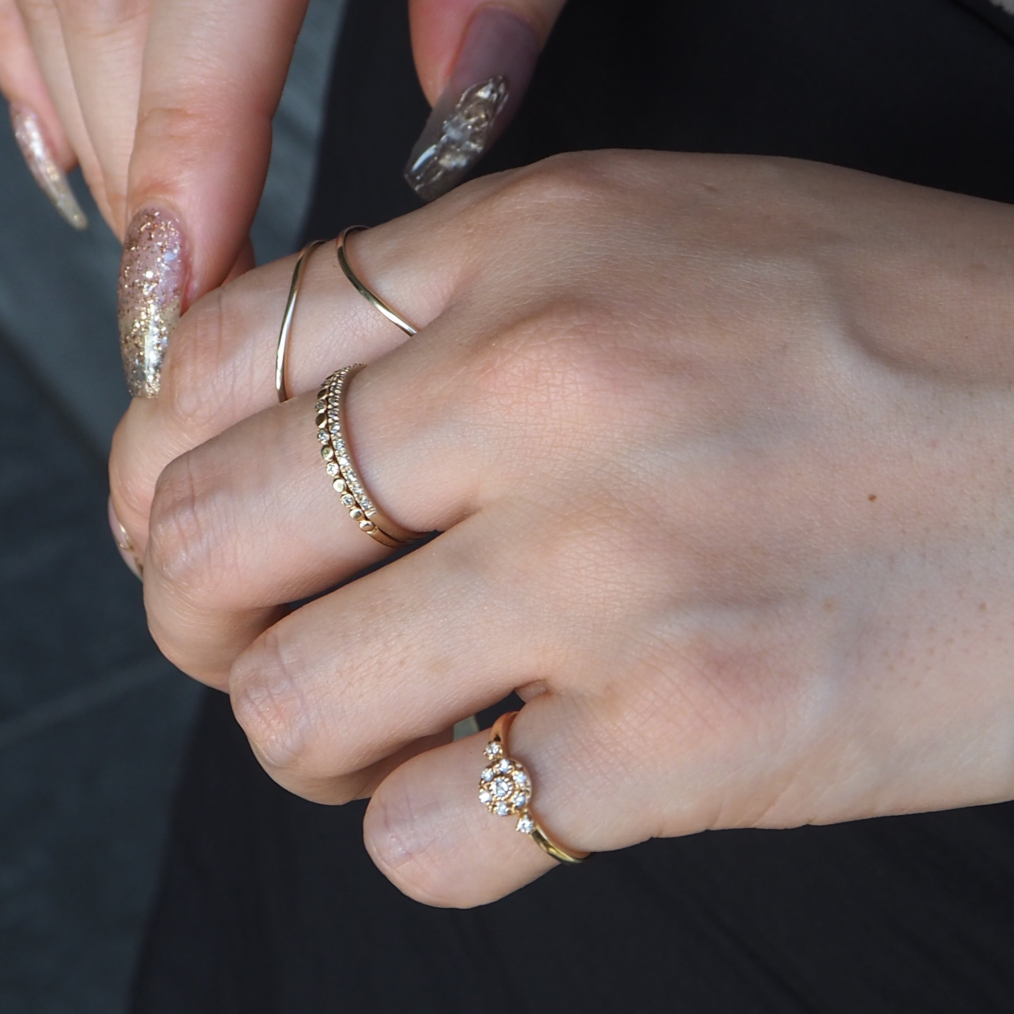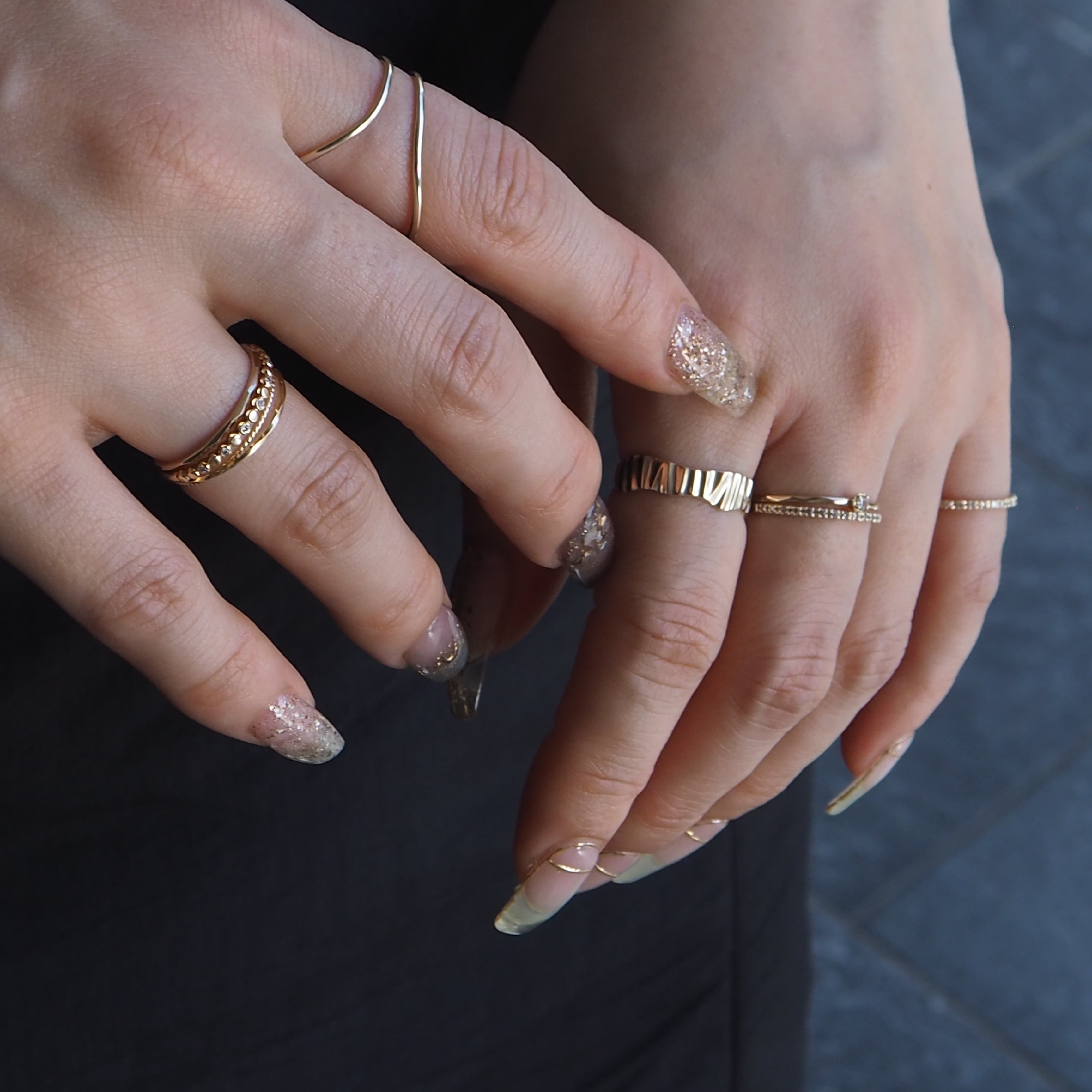お持ちの華奢リングとあわせて、これ一つで旬なコーディネートに。